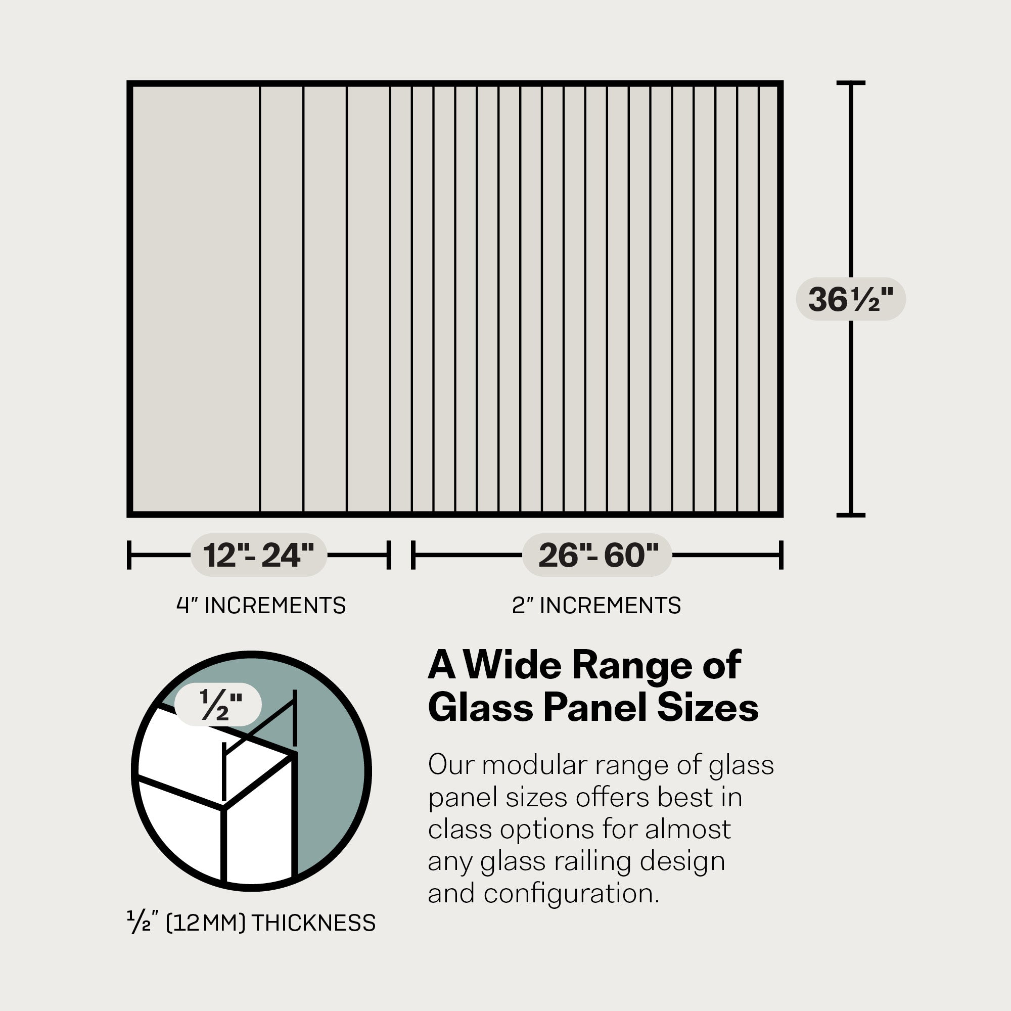 36.5" high glass panels available in 12 to 24" in 4" increments and 26 to 60" in 2" increments