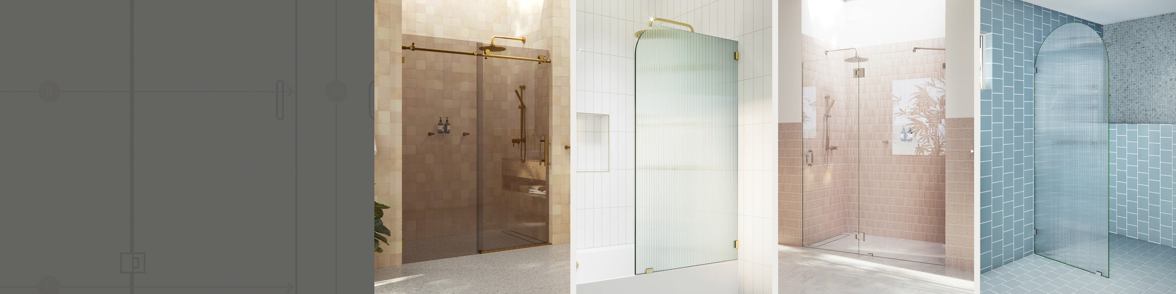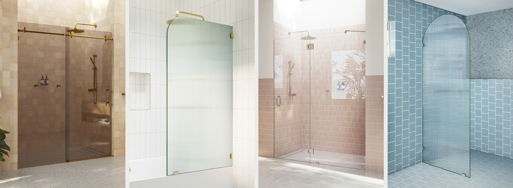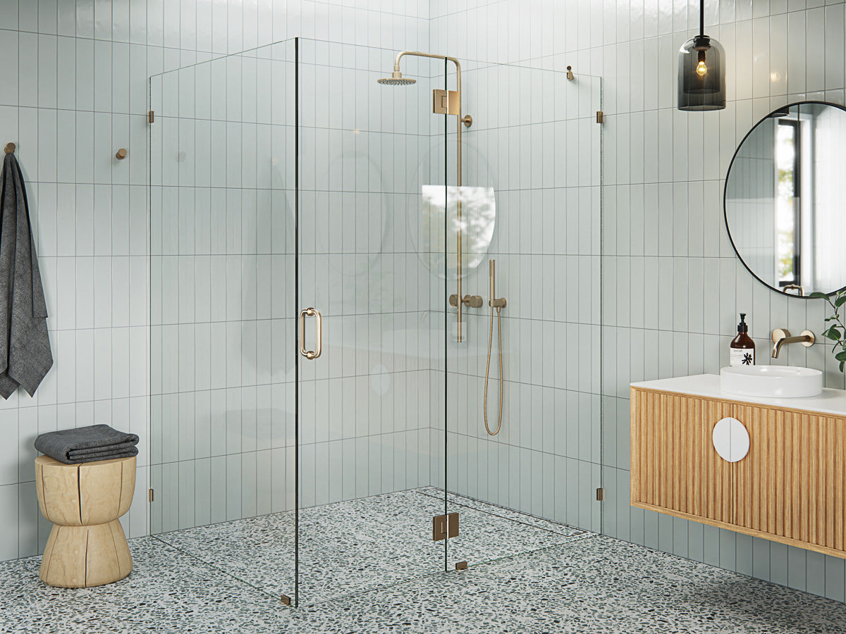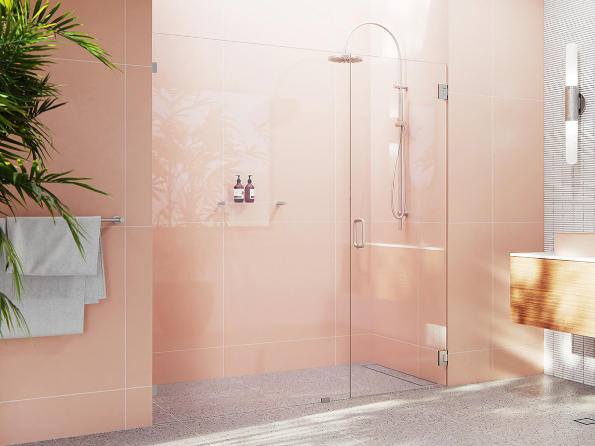 A collection of frameless hinged and sliding shower doors that feature a corner return glass panel. Designed as a unique alternative when alcove showers are not viable option, adding a third dimension for depth.
