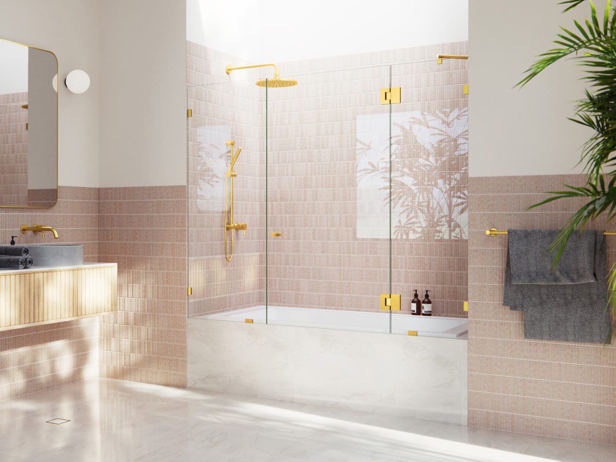 Frameless hinged bathtub doors that swing open for a clean, modern look and easy entry. A sleek alternative to shower curtains with durable glass and hardware.