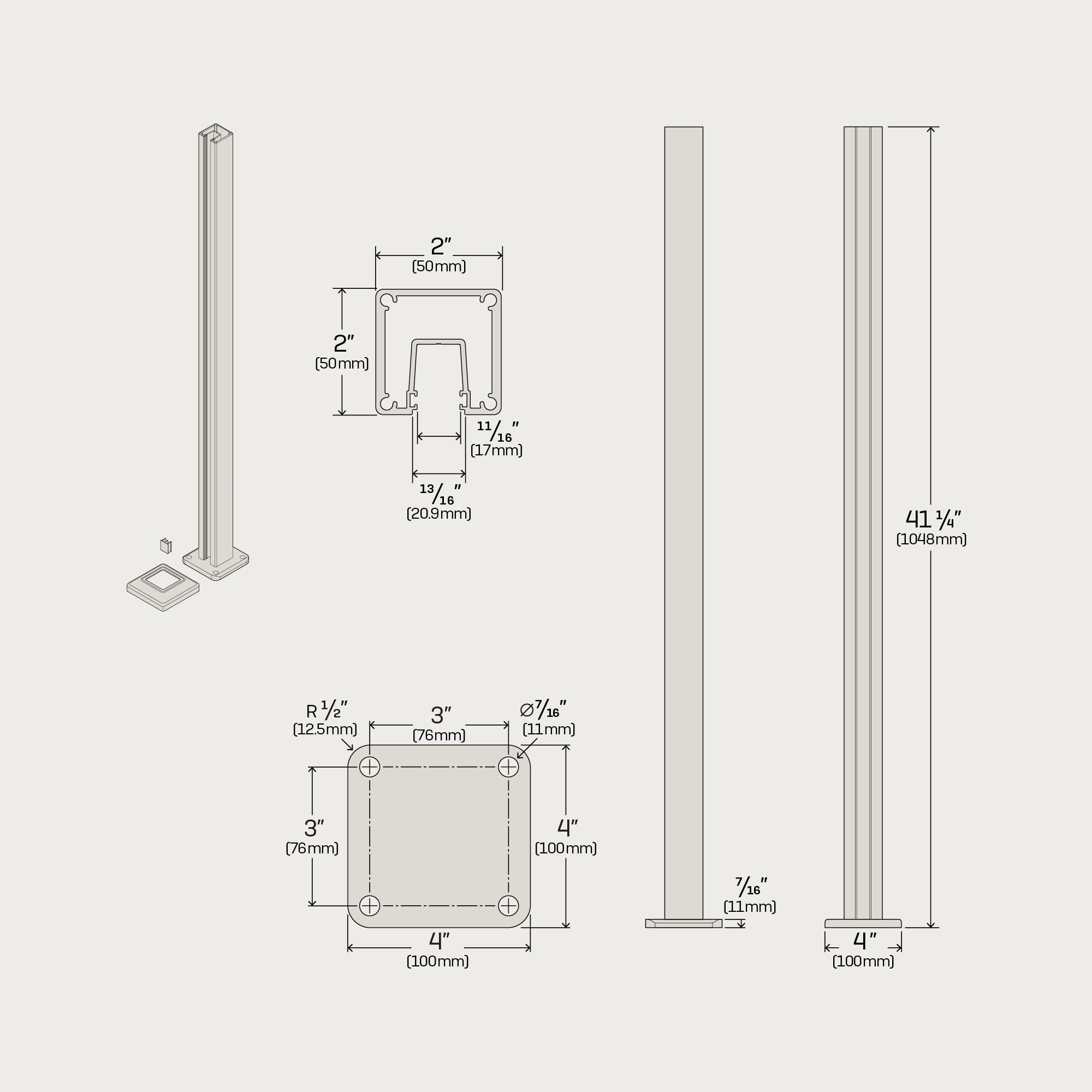 Portia - Aluminum Two-Way/180° Join Post Dimensions